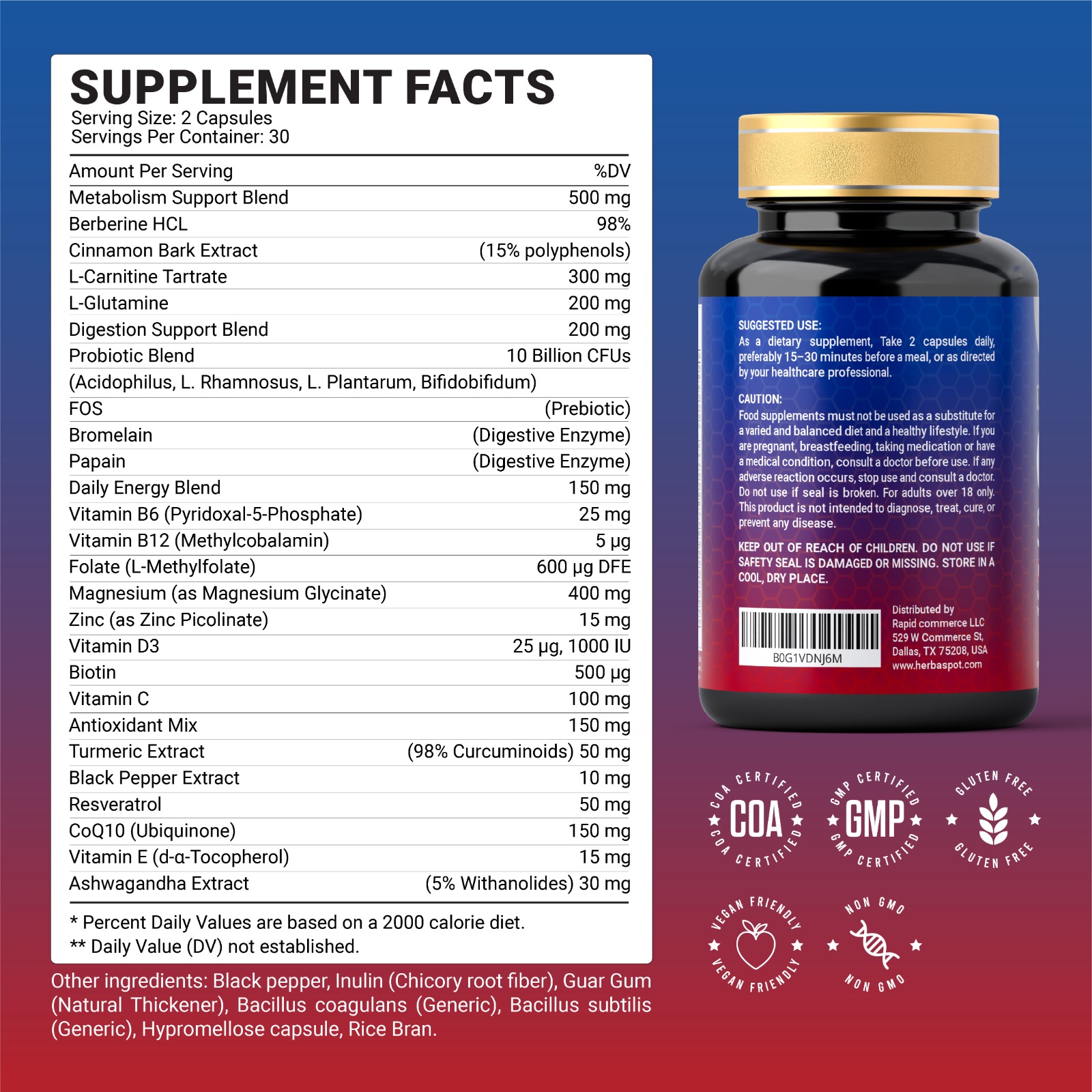 | Special Ingredients | L-Carnitine, L-Glutamine, Probiotic |